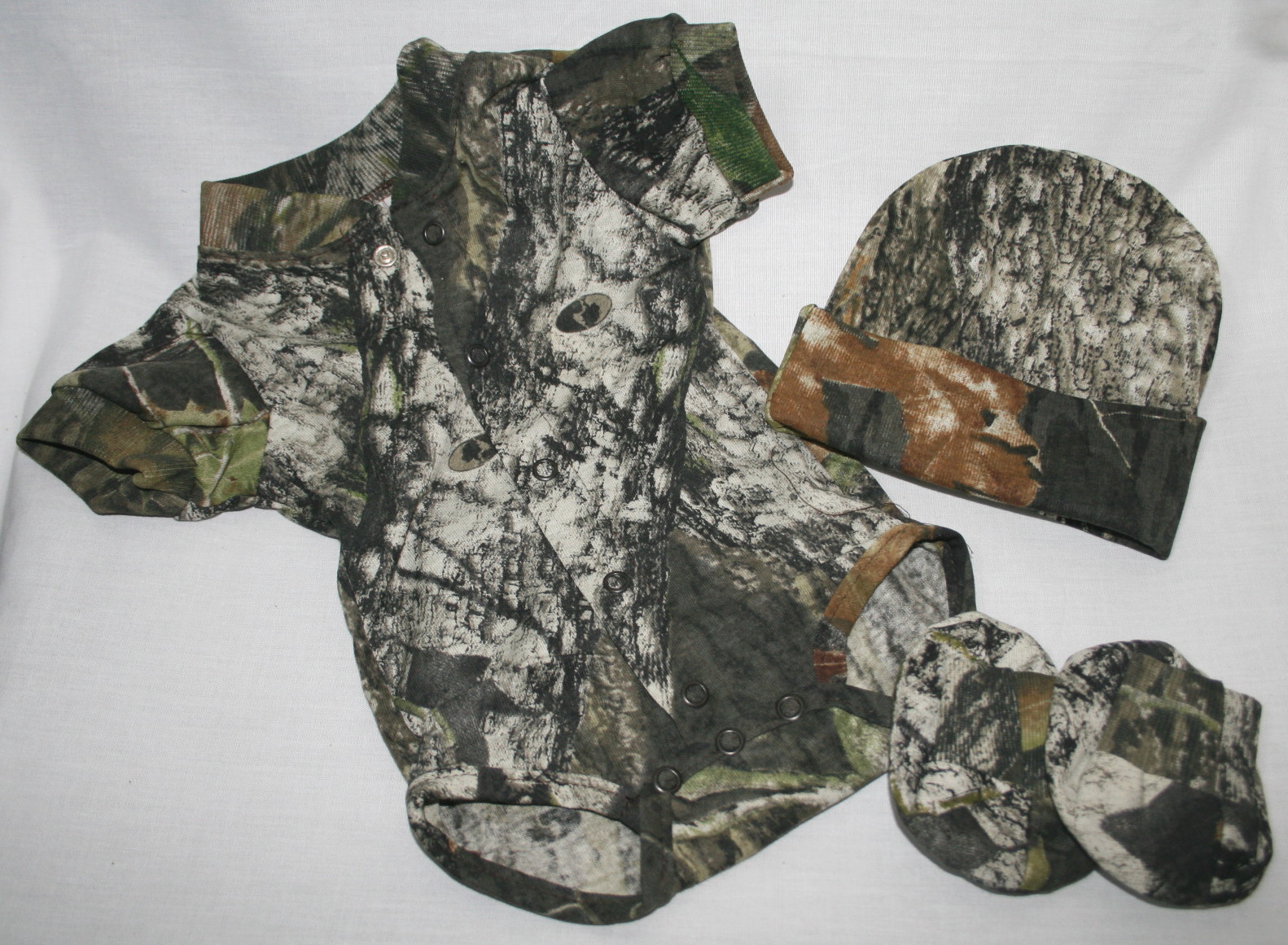This cute 3 piece set is in officially licensed Mossy Oak camo design and is made in a soft jersey material. It comes with 3 pieces - a short-sleeved onesie, matching hat, and matching booties. This is an adorable set. It snaps down the front for easy dressing.